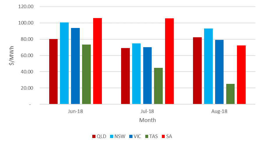 The lower Tasmanian prices didn’t result in lower prices for the rest of the National Electricity Market (NEM). Across all regions, the prices during the 2018 winter were lower than the 2017 winter, however were still very high in a historical context. Looking back across the last 10 winters, the previous two (three for South Australia where Northern Power Station closed in May 2016) look like outliers. In fact, averaging the previous 8 years from 2008 to 2016, prices have been lower for all regions.